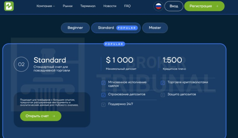 Площадка позиционировалась как международный брокер, но судя по рекламе сделана под русскоязычную аудиторию. Стандартные несколько уровней счетов. На начальном этапе доступно плечо до 1:100, что уже выходит за рамки законодательства.