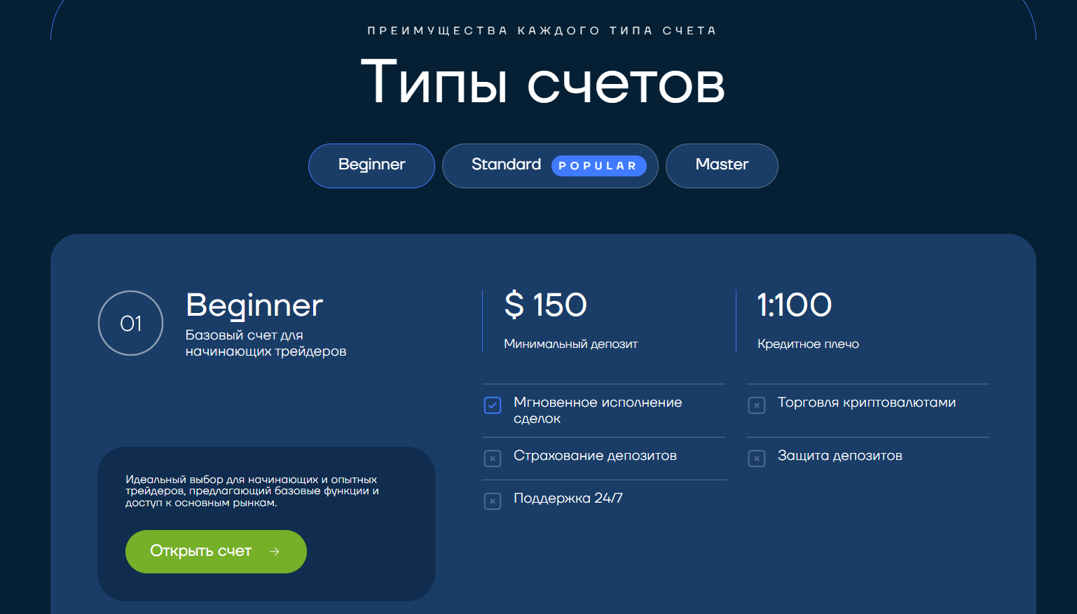 Перейдем к функционалу. Сайт предлагает 3 варианта сотрудничества, на каждом из них нам обещают моментальное проведение сделки. Это единственная функция, которая доступна на самом дешевом варианте сотрудничества. На среднем уровне к вашим привилегиям добавится страхование депозитов, а также откроется функционал трейдинга криптовалютами.