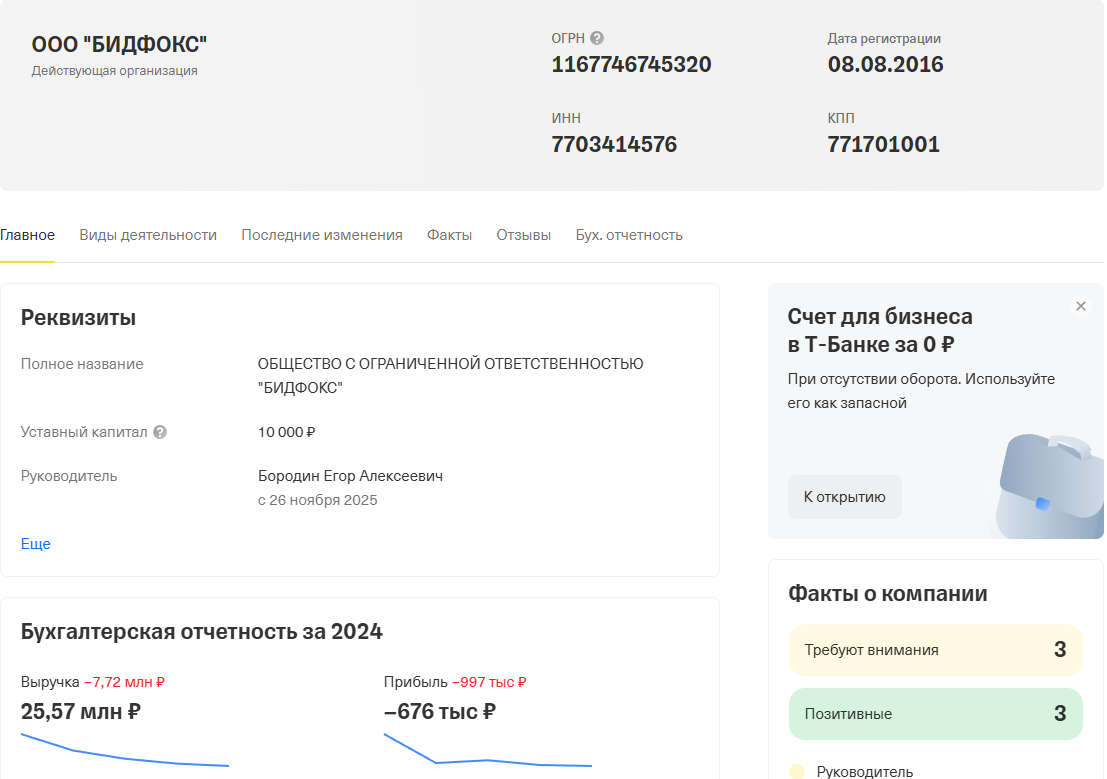 Домен сайта зарегистрирован 1 марта 2016 года, а с августа компания легально работает как ООО «Бидфокс» и занимается разработкой программного обеспечения, показав по данным финансовой отчетности за 2024 год убыток в размере ₽676,000 при выручке более ₽25,000,000.