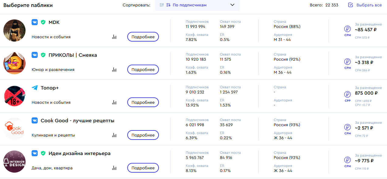 Каталог биржи «Бидфокс» показывает ориентировочные цены прямо в поиске. Размещение в крупном новостном паблике на 11 000 000 человек обойдется рекламодателю примерно в ₽85,000, а маленькие узкотематические каналы про психологию берут около ₽1,000 за один пост. Владельцы сервиса утверждают об использовании собственных фильтров для отсеивания накрученных ботов.