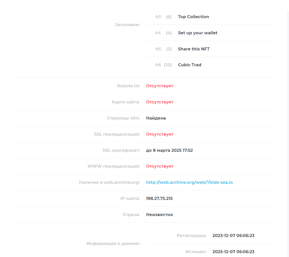 Домен Bids-sea.io зарегистрирован в декабре 2023 года. Но первые отзывы о компании в сети появились только в феврале 2025 года. Это говорит, что до этого момента сайт не существовал. Кроме того, срок регистрации – только до марта 2025 года. Это значит, что его владельцы изначально не рассчитывали на долгую работу на этой площадке.