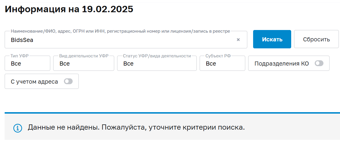 Названия BidsSea нет на сайте Центрального Банка России. Значит, законодательством нашей страны деятельность не регулируется. И если с платформы не удастся вывести деньги, решить этот конфликт будет сложно.