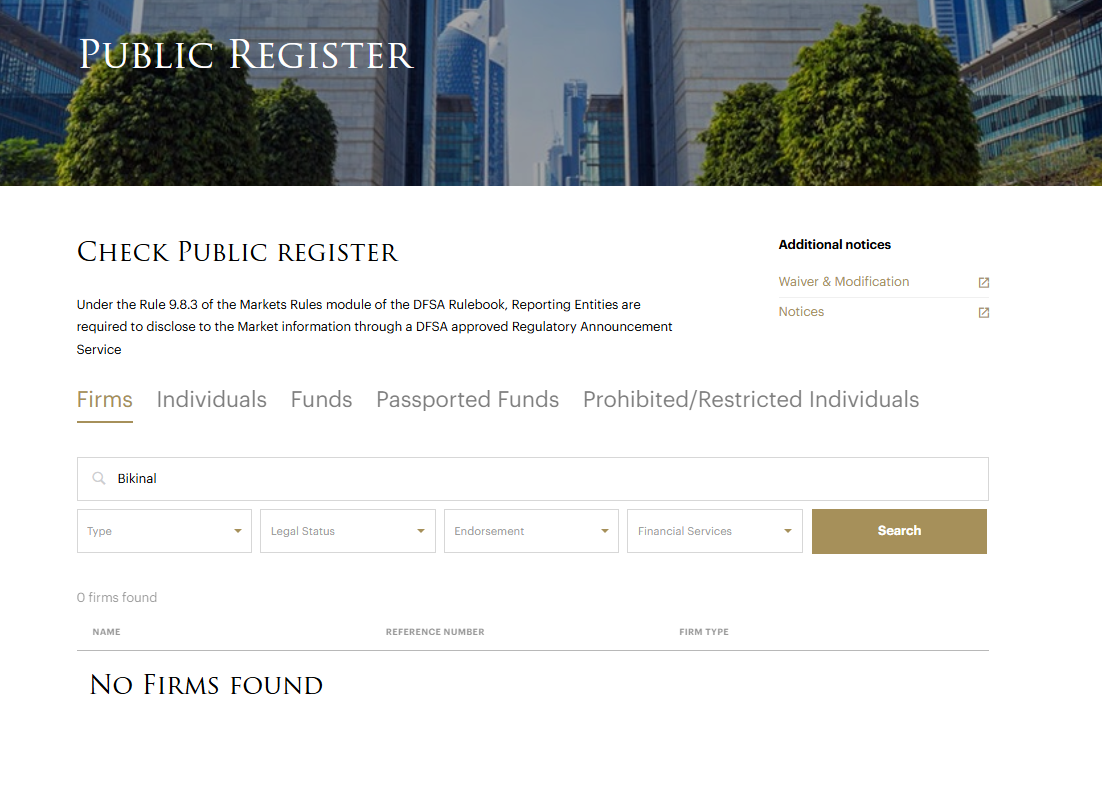 На сайте брокер указывает на наличие целых четырех лицензий международных регуляторов. Сообщается даже номер лицензии в финансовой комиссии DFSA. Однако, проверка публичного реестра дубайской комиссии показала, что организация с таким названием в ее регистре не значится. Очевидно, брокер пытается создать видимость законности своей деятельности и размещает ложные сведения.