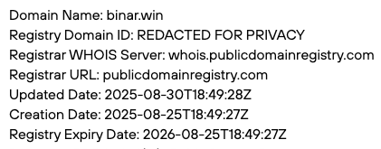 Мы выяснили, когда биржа binar win начала функционировать. Для этого запросили сведения о ее доменном имени из WHOIS.