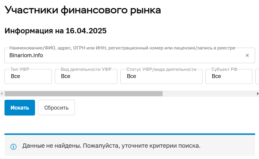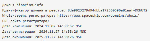 Хоть и в сети есть упоминание об официальном сайте, но перейдя по нему пользователи сразу попадают на платформу Workspace Binariom Info. Его домен был зарегистрирован в конце 2024 года, значит брокер имеет довольно небольшой опыт в инвестиционной деятельности.