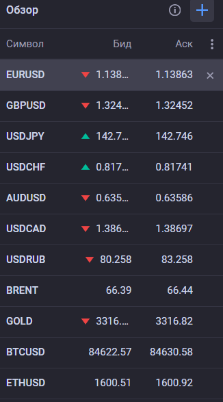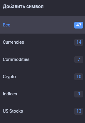 В таблице указан бид, аск, спред, а также своп шорт и своп лонг. В этот список каждый пользователь может добавить активы других рынков. Доступны валюты и криптовалюты, индексы, акции и товары.