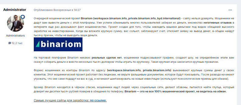 На независимых сайтах о брокере оставляют довольно негативные упоминания. Пользователи пишут в отзывах о том, что Binariom – лохотрон и занимается разводом на деньги.