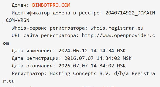 Сервис BinBotPro появился в 2016 году, что подтверждает проверка регистрации домена binbotpro com.