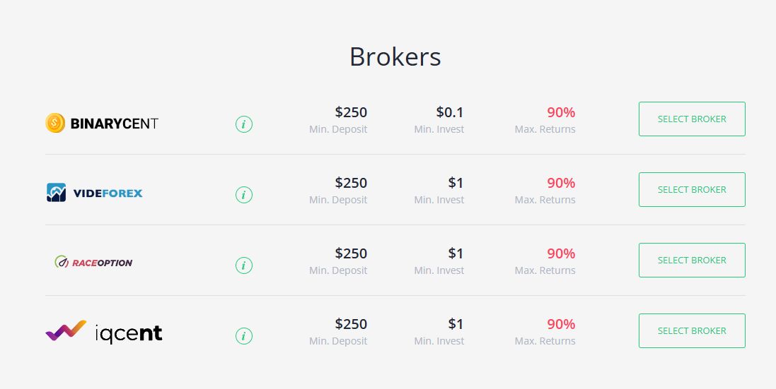 Компания не имеет лицензии от финансовых регуляторов, однако работает в связке с несколькими лицензированными брокерами: BinaryCent, VideForex, RaceOption и IqCent. Это несомненный плюс, так как вероятность мошенничества куда ниже.Стоимость услуг