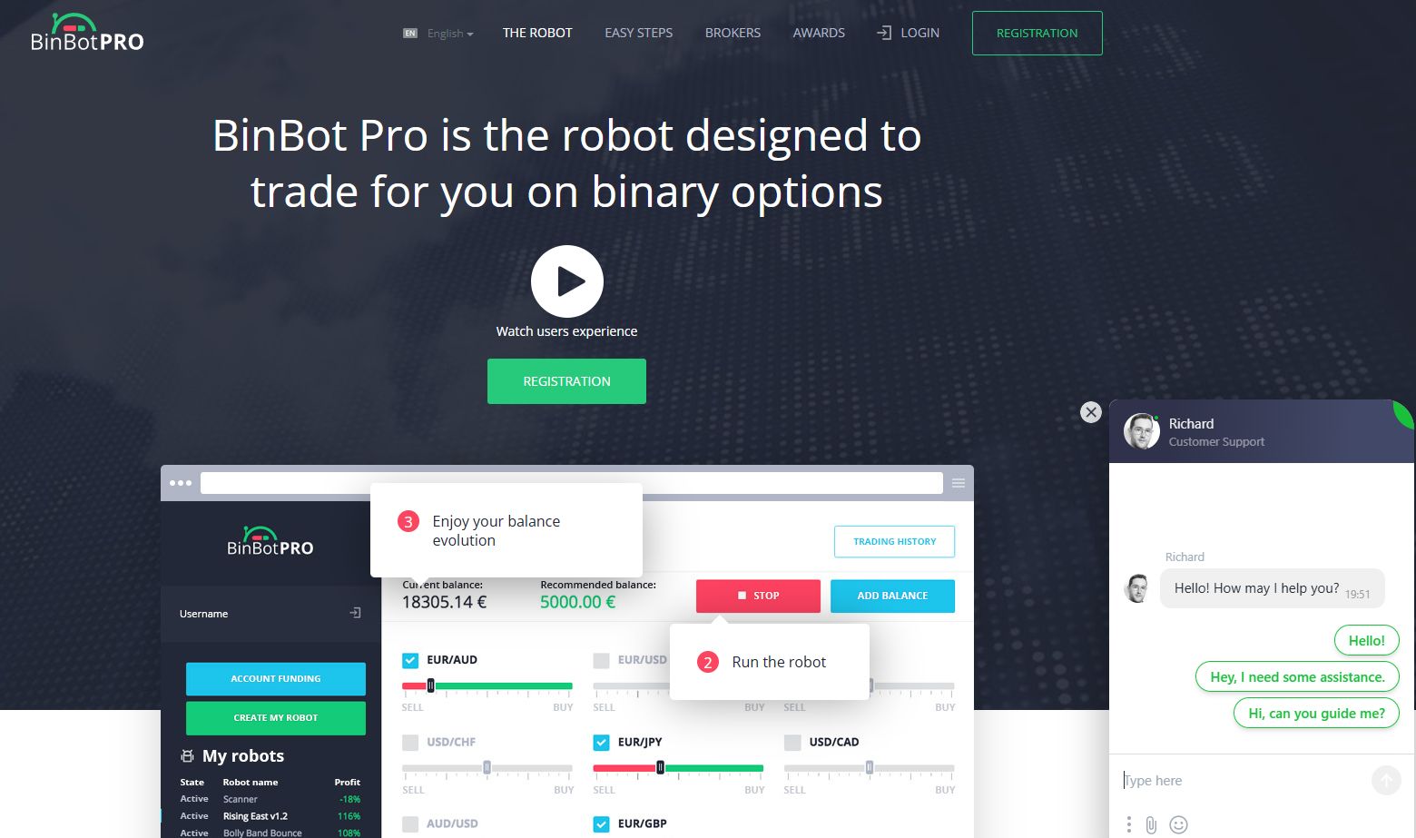 Программа «Бинбот» адаптирована под потребности разных брокеров, предлагая индивидуальные условия. Начать торговлю можно с $250. Пользователь выбирает бота, который наиболее подходит ему по риску и прогнозируемой прибыли. Дополнительно предлагаются промокоды, позволяющие получить бонусы при пополнении счета через подключенных брокеров.