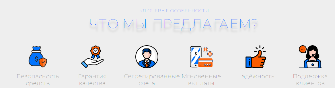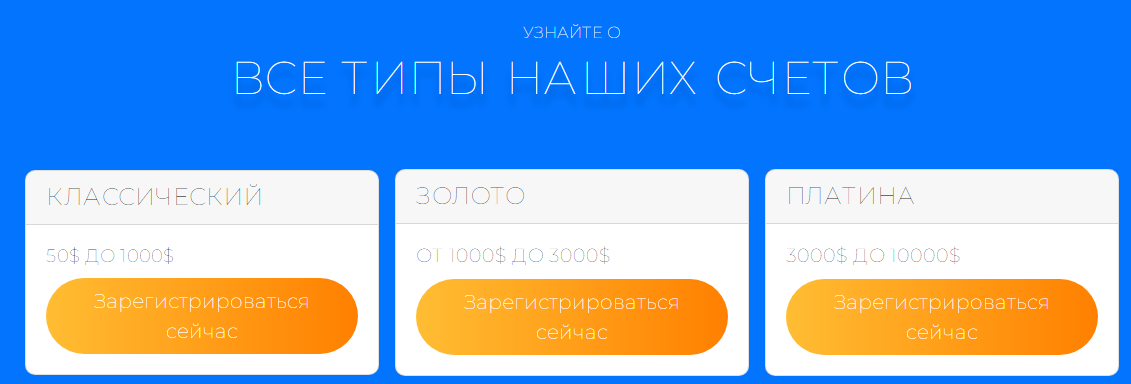 После регистрации аккаунта клиент попадает в личный кабинет, где может пополнить баланс кошелька депозитом. Внесение денег на счет возможно с банковской карты или онлайн-кошелька. От суммы депозита зависит тип счета и потенциальная прибыль. Полная информация о счетах открыта только зарегистрированным клиентам.