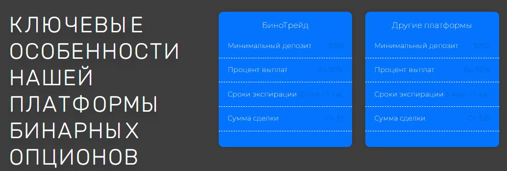 Минимальный депозит на платформе от 150$, а сумма сделки – 1$, срок экспирации от 30 секунд до часа.