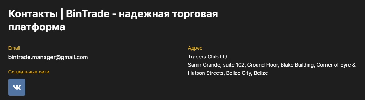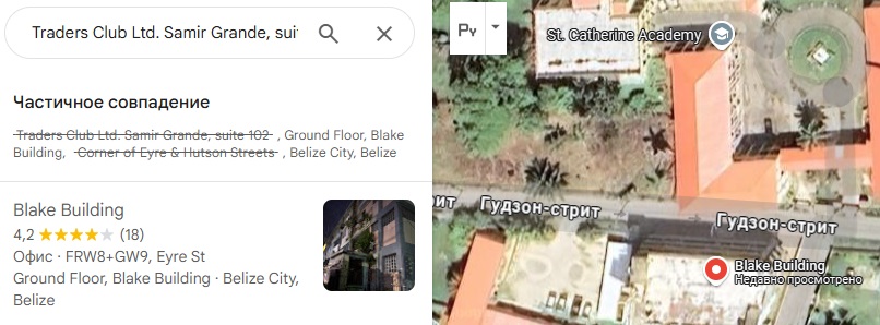 Также в данном разделе можно увидеть адрес компании «Бинтрейдброкер». Офис брокера расположен в государстве Белиз. После небольшого анализа стало понятно, что данная страна является оффшорной зоной – излюбленным местом мошенников. Более того, во время поиска указанного офиса удалось найти только само здание. Каких-либо организаций с подобным названием там не обнаружено.
