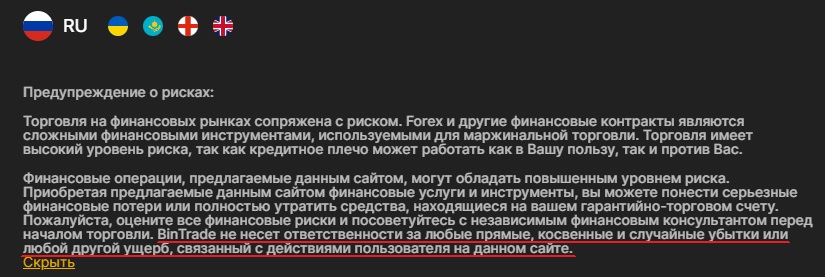 На официальном сайте брокера Bintradebroker Teck нет раздела, посвященного лицензированию. Более того, нам не удалось найти документацию, подтверждающую право организации на ведение брокерской деятельности. На площадке отсутствует лицензия от ЦБ РФ. При том, что наличие данного документа обязательно, ведь подобные услуги должны регулироваться.