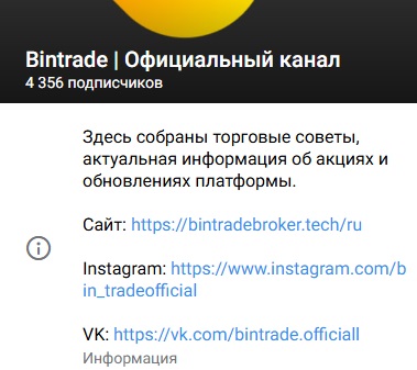 Аккаунт в Телеграме называется Bintrade, найти который можно написав в поисковой строке никнейм bintradeclub1. Сообщество является информационным блогом, в котором публикуются главные новости платформы и даются некоторые советы по эффективной торговле на бирже.