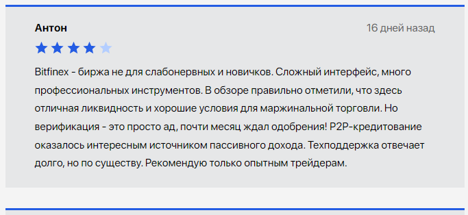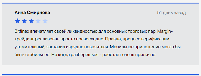 У биржи Bitfenix в основном положительные или нейтральные отзывы. Антон отметил в своем комментарии долгую проверку документов и сложность интерфейса.