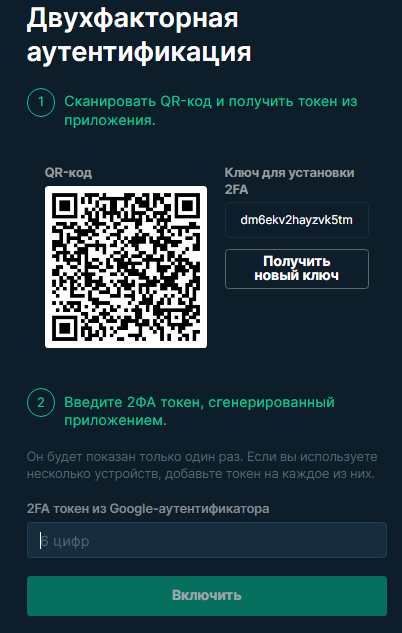 Для безопасности личных данных биржа «Битфинекс» использует двухфакторную идентификацию. Через приложение Google Authenticator нужно отсканировать QR-код, чтобы получить 2ФА токен и использовать его затем для авторизации.