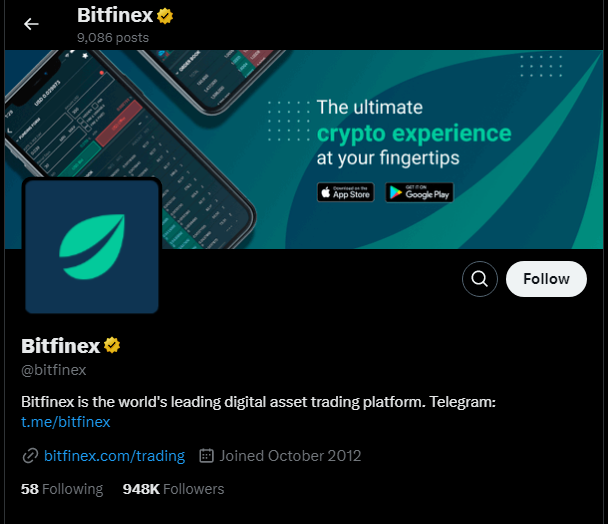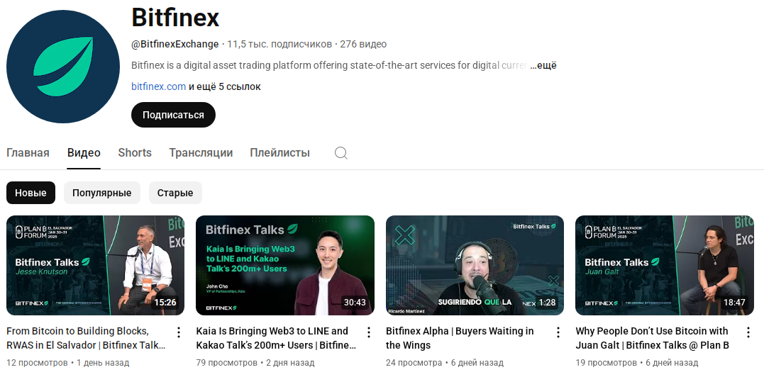 На Youtube-канал Bitfinexexchange подписаны 11,5 тыс. человек, он регулярно обновляется. Есть образовательные видеоролики на английском языке, но видео набирают очень мало просмотров. Вероятно, канал не пользуется популярностью у трейдеров.Аккаунт в X с почти 1 млн. подписчиков заброшен. Последний пост был опубликован в марте 2024 году