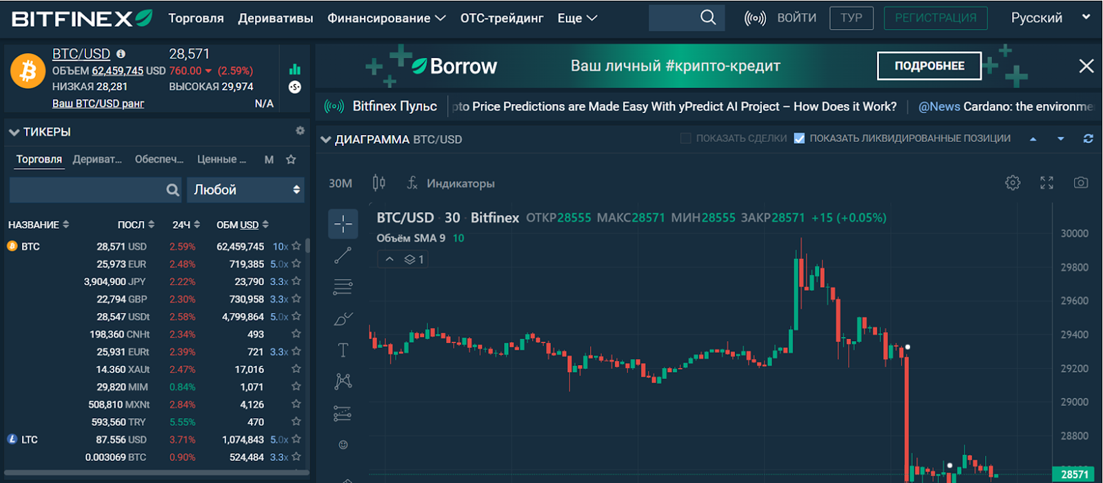 В онлайн-терминале «Битфинекс» можно торговать криптовалютой, фиатом, акциями. Трейдеру доступны десятки инструментов. Курсы в терминале отображаются корректно. На графике можно менять временную шкалу от 1 секунды до 1 месяца, рисовать линии Фибоначчи, кривые, пользоваться сигналами и другими инструментами технического анализа.