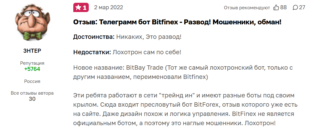 У пользователей требовали внесения дополнительных средств, но даже после этого получить свои деньги обратно им уже не удавалось, а в отзывах о BitFinex Trade в Телеграмм пишут, что поддержка постоянно присылала сообщения о необходимости новых пополнений. Положительно никто о проекте не высказывается, поэтому репутацию можно считать отрицательной.