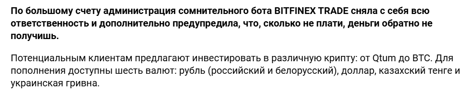 - Отсутствие связи BitFinex Trade в Телеграмм с официальной биржей и поддержкой повышает риски потери средств при инвестировании.