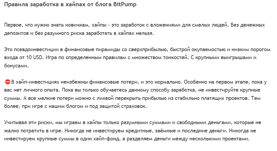 В постах часто дается ссылка на полный обзор проекта, которая отсылает на официальных сайт bitpump ru. Какие-либо подтверждения компетентности авторов проекта отсутствуют. Нам не удалось найти ни сертификатов, ни информации, подтверждающей финансовые знания создателей канала. Также нет доказательств успешности предлагаемых хайп-проектов. Многие из них могут оказаться рискованными и привести к потерям денег.