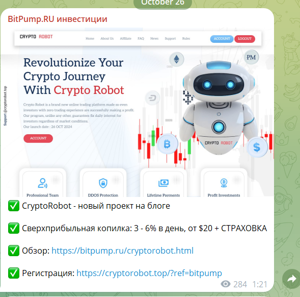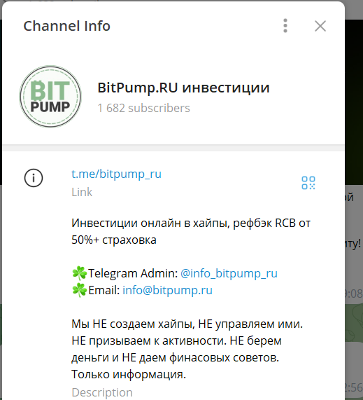 BitPump RU инвестиции позиционирует себя как проект, предоставляющий ценную информацию для инвестора. Авторы убеждают в своей надежности. Телеграм-канал занимается публикацией обзоров на проекты, в которые могут вступать инвесторы и быстро приумножить свой капитал. В большинстве случаев упоминается о том, что есть страховка.
