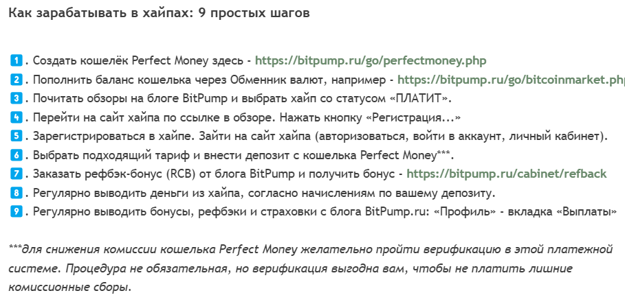 Для этого необходимо зарегистрироваться на сайте, создать кошелек Perfect Money и пополнить его. После чего предлагается выбрать хайп-проект из обзора, перейти на их сайт и оплатить депозит выбранного тарифа. Далее, по словам авторов, останется лишь выводить начисления и бонусы, а когда проект перестанет платить, то еще и страховку.