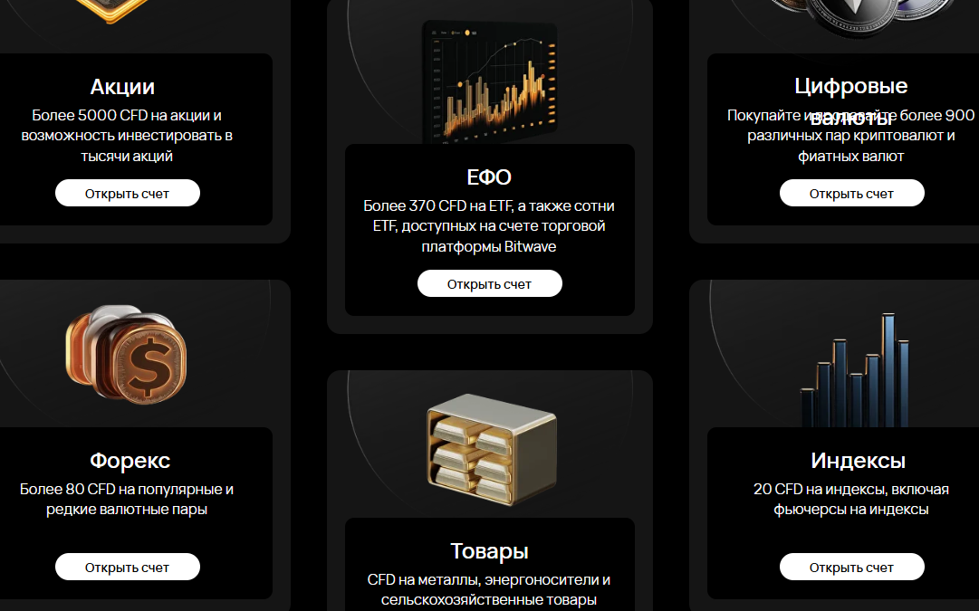 Биржа Bitwave Capital com открывает доступ к торговле акциями, валютами, криптовалютами, товарами, индексами и ETF. Однако конкретные активы увидеть нельзя: для этого нужно зарегистрироваться и пройти сложную верификацию.