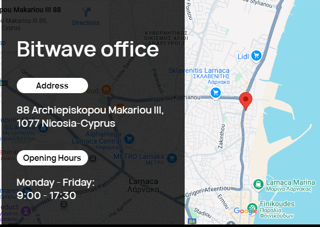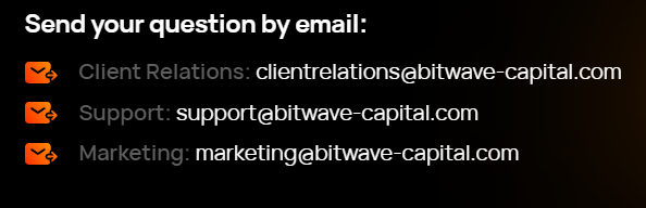 Для связи с поддержкой есть 3 адреса электронной почты: Clientrelations @ Bitwave Capital com, Support @ Bitwave Capital com и Marketing @ Bitwave Capital com. Подчеркивается, что специалисты работают только по будням в дневное время. Отсутствие круглосуточного доступа и удобных каналов связи вроде мессенджеров — это большой минус.