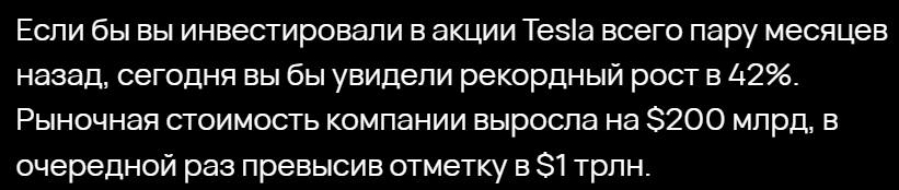 Площадка призывает скорее пополнить депозит и начать торговать, соблазняя тем, что «акции Tesla за 2 месяца выросли на 42%». Это обещание быстрой прибыли, что совершенно недопустимо для официального брокера.