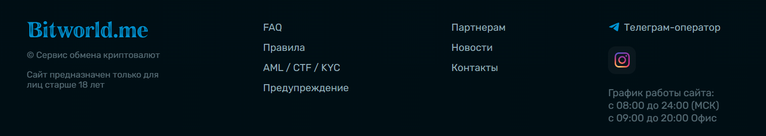 Обменник работает не круглосуточно, а только с 08:00 до 24:00 по московскому времени. Указано также, что офис открыт с 09:00 до 20:00 по Мск, но его адрес не указан. На сайте также есть раздел с новостями – первая запись «БитВорлд» была опубликована в 2019 году, далее одна в 2022 году, две в 2023 году и последняя в июне 2025 года – в ней как раз сообщается о ребрендинге сети.