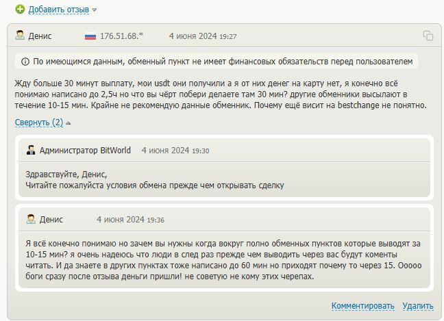 Отзывы об обменнике опубликованы на самом сайте, всего их более 100, все положительные. Самый ранний оставлен в 2020 году, последние – в 2025 году. Как это возможно – непонятно, ведь новый сайт столько времени не существует. Обычный посетитель может оставить отзыв на Bit World, заполнив специальную форму, но сообщение проходит обязательную ручную модерацию и в конечном итоге может просто не отобразиться.Много положительных отзывов и на сайте BestChange – указанном в качестве партнёра обменника. Тем не менее встречается и критики – недовольные пользователи пишут, что иногда заявки обрабатываются очень долго, и такие задержки не добавляют комфорта работе.