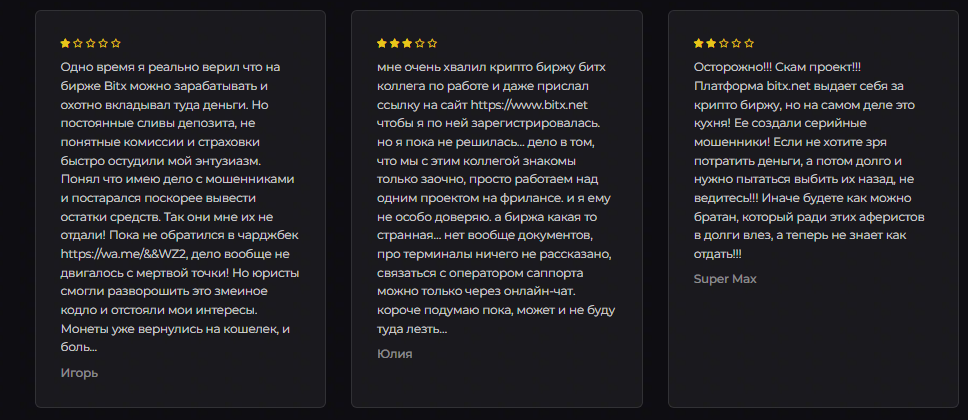 Платформа Bitx Ex отзывы имеет, однако многие их них именно негативные. Пользователи в интернете активно пишут жалобы на сервис, причем у каждого есть своя причина. Клиенты площадки отмечают, что проект не имеет никаких документов, как и заявленных качественных услуг и преимуществ, а также, компания постоянно блокирует счета при попытке вывести деньги или сразу же после пополнения баланса.