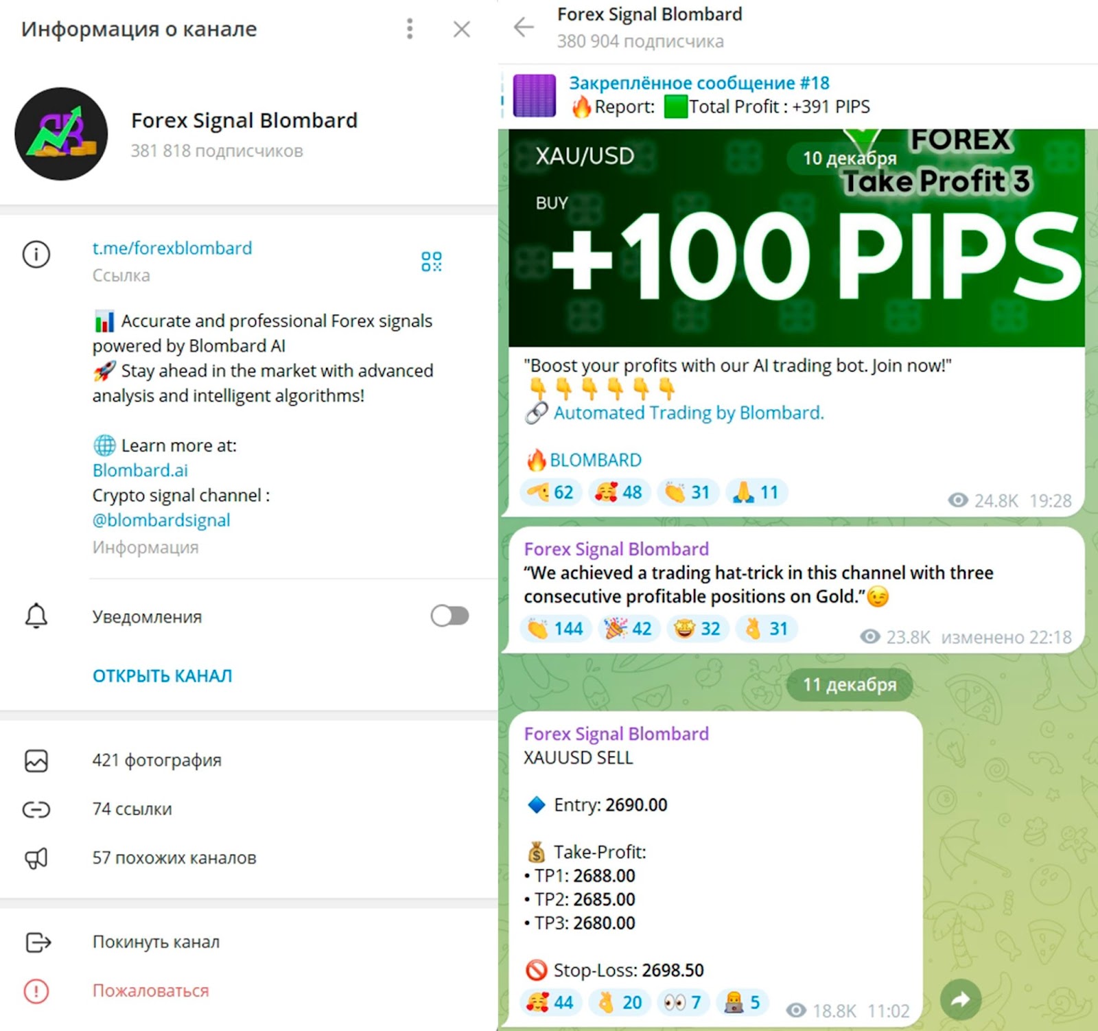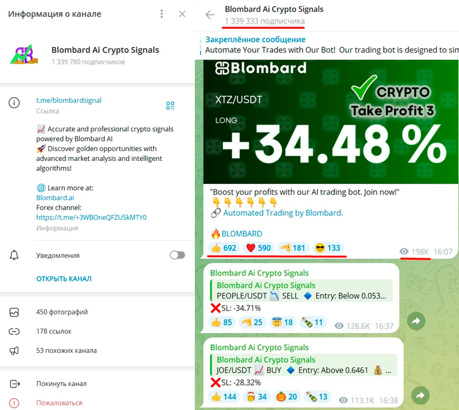 В телеграме у брокера blombard есть несколько каналов и приложений. Например, на телеграм-канал blombardsignal подписано более миллиона пользователей. В сообществе публикуются сигналы от торгового бота, в том числе убыточные. Активность на канале выше средней, но отключены комментарии.