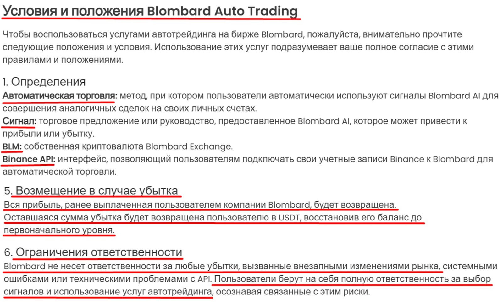 В условиях и положениях blombard есть противоречивые пункты. Например, в 5 пункте платформа обещает пользователям возмещение убытков. Но в 6 пункте компания отказывается от ответственности, если клиент выбрал сигналы или использовал услуги автотрейдинга.