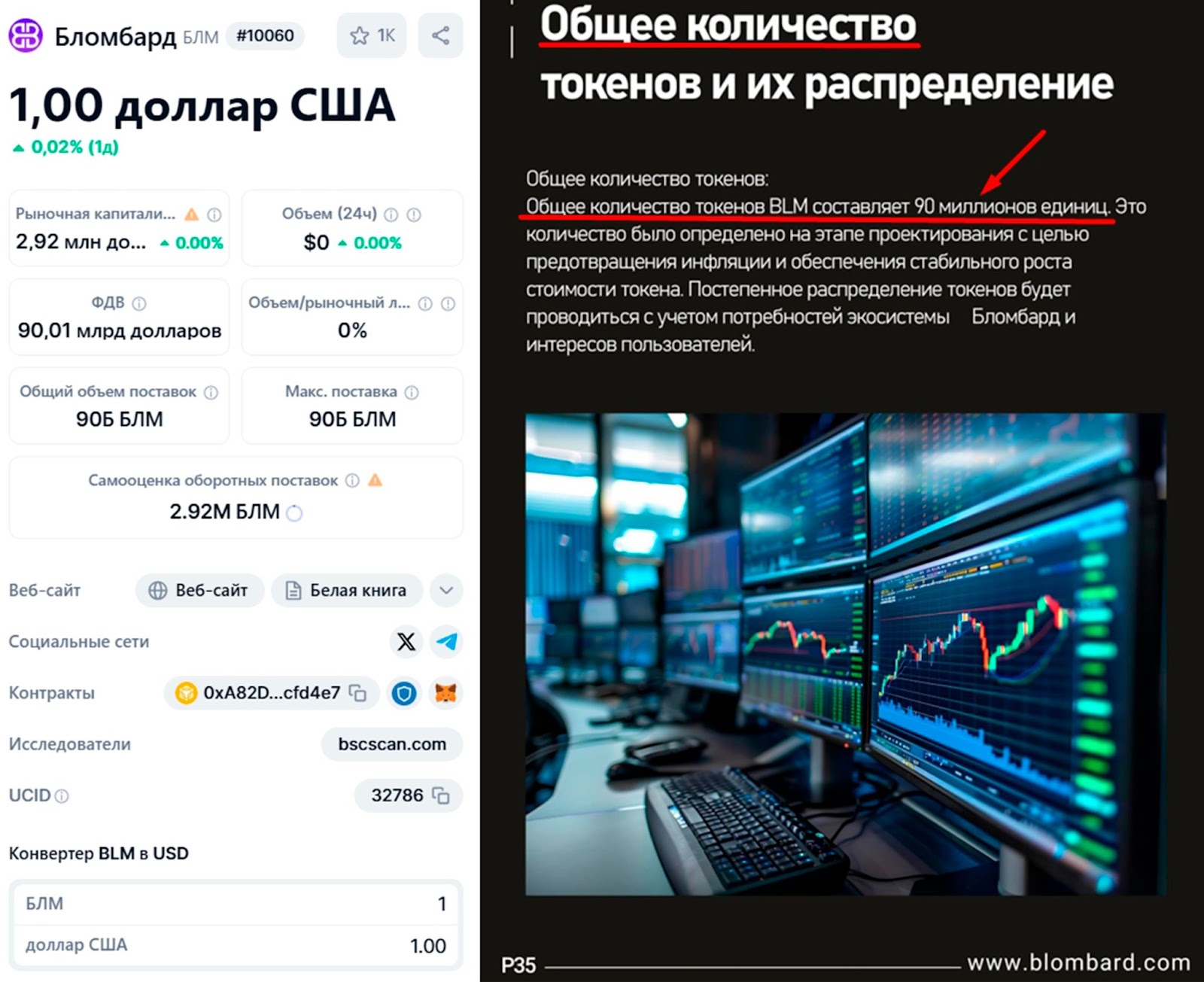 На специализированных платформах можно узнать публичную информацию о криптопроекте бломбард. Например, на CoinMarketCap и Binance указано, что token от blombard com предварительно стоит 1 доллар и выпущен объемом 90 миллиардов монет. Токен еще не залистился, но уже торгуется на сети BNB Chane.