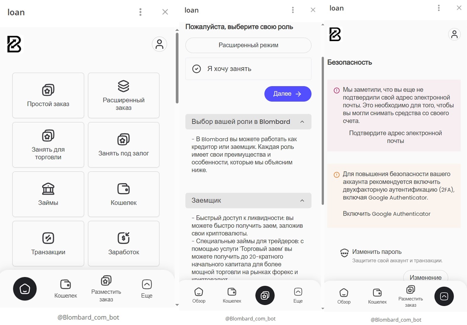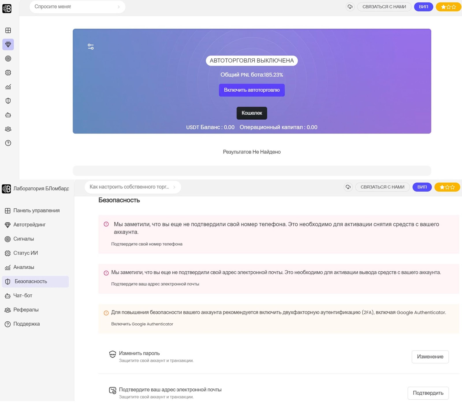 Для автотрейдинга нужна регистрации на сайте blombard ai. После авторизации пользователя перенаправляет на веб-страницу panel blombard ai. Клиент может начать торговать, если пополнить счет от 10$. В меню безопасности доступно подтверждение аккаунта по электронной почте и номеру телефона, дополнительно есть двухфакторная аутентификация.