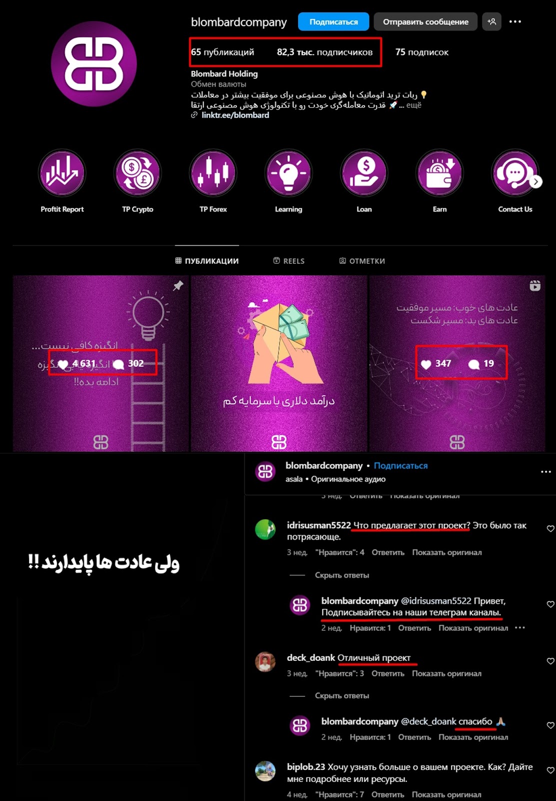 Аккаунт в инстаграм blombard ориентирован на аудиторию из Ирана. На профиль подписано 82 тысячи пользователей. Активность на канале выше средней.