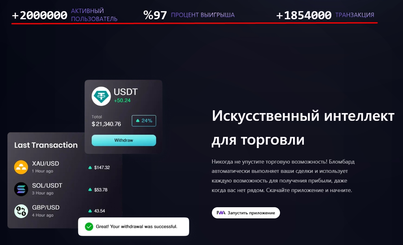 На веб-странице указано, что у платформы 2 миллиона активных пользователей и винрейт 97% от автотрейдинга. Это высокий показатель для торгового бота, у которого нет кейсов с подтверждением на сайте.