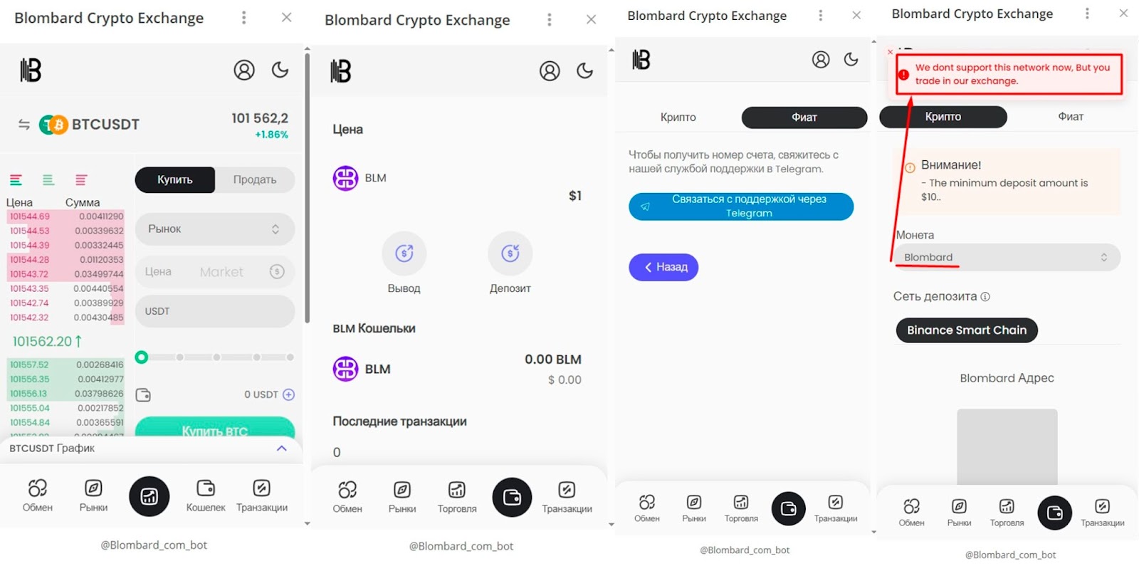 Интерфейс биржи blombard exchange не имеет уникальных отличий. Например, валютные пары с USDT и возможность быстрого обмена крипты. На платформе доступна торговля токеном BLM, но нет данных о комиссии и спредах. При попытке перевода монет в сети BNB Chane сервис выдает ошибку. При анализе веб-страница выглядит как фейковая.