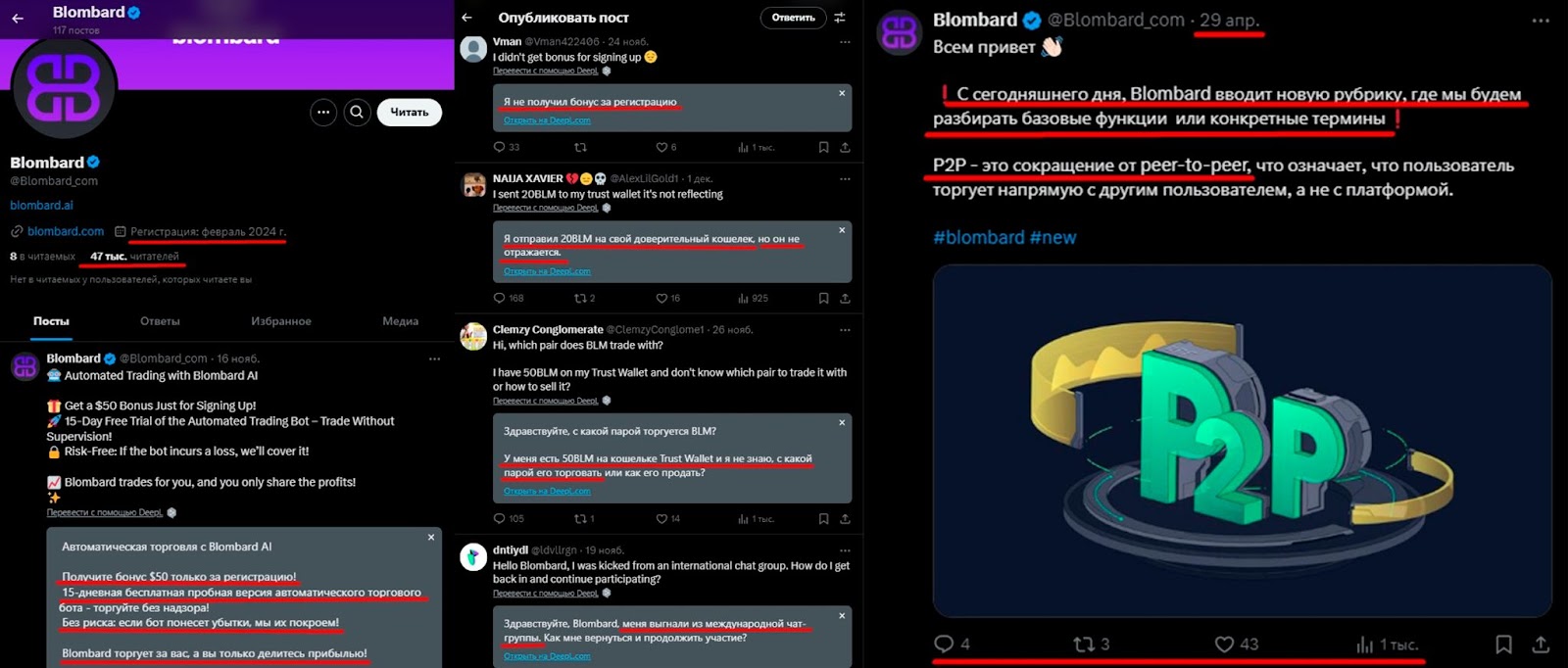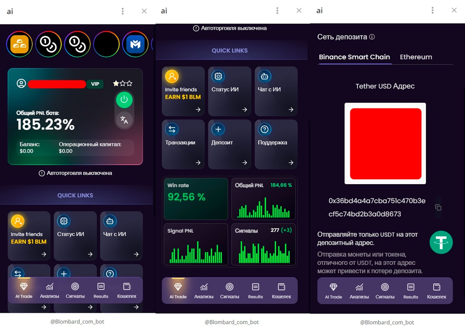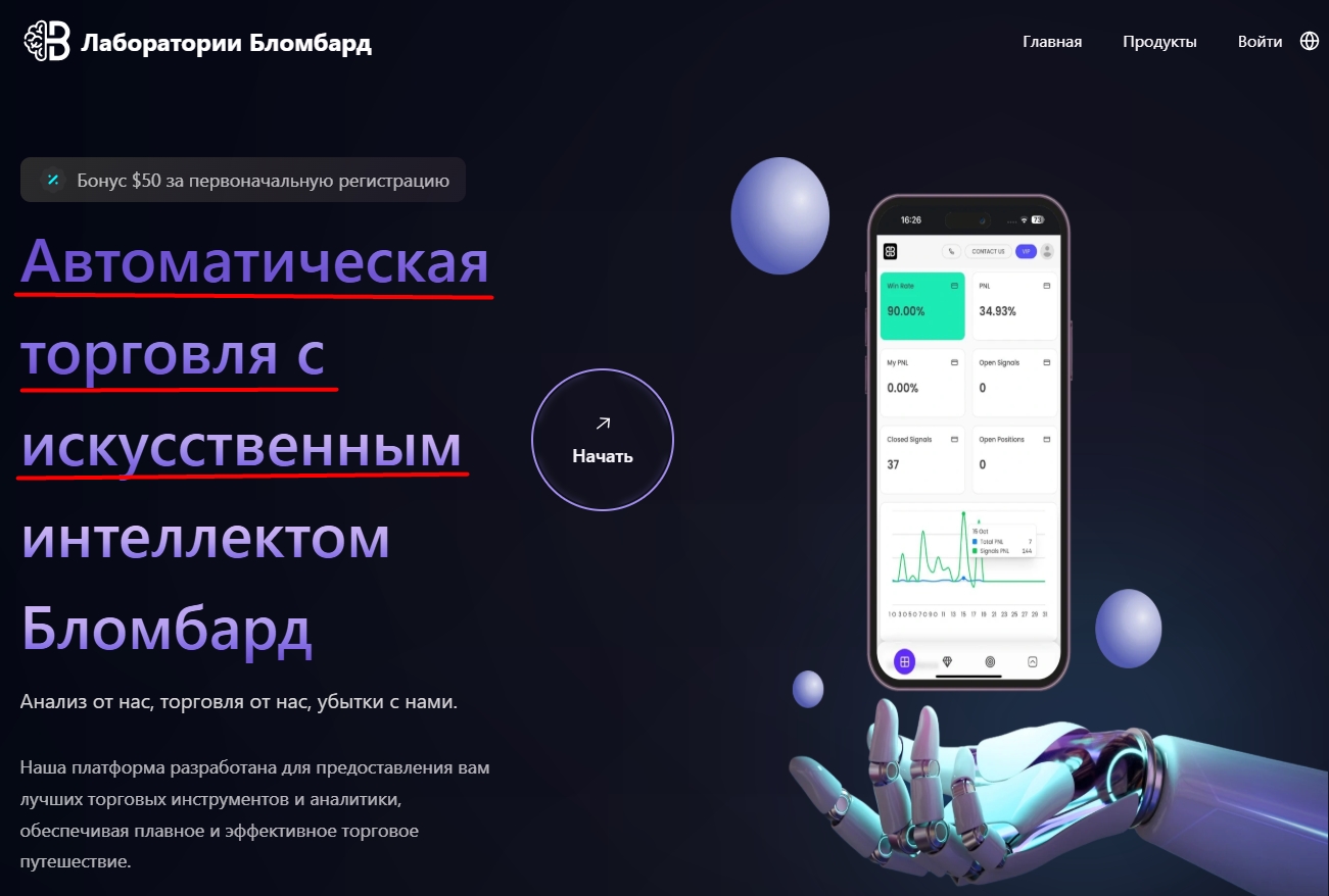У проекта есть отдельный сайт blombard ai, на котором предлагается автотрейдинг через торгового бота. Сервис предоставляет аналитическую торговлю и готов покрыть убытки клиента. За регистрацию пользователь может получить 50$.