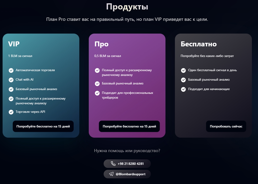 В блоке с предложениями клиенты могут пользоваться общедоступным вариантом с 1 сигналом в день или попробовать платную версию с пробным периодом в 15 дней. Например, вип план предоставляет автотрейдинг с ценой 1 BLM за сигнал.