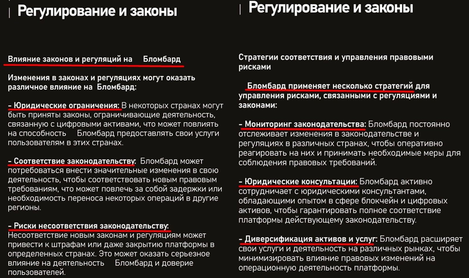 В white paper blombard есть страницы с регуляцией. Например, юридические аспекты, особенности регионального законодательства и возможные риски. Но информация поверхностная и не описывает конкретные проблемы, с которыми могут столкнуться трейдеры.