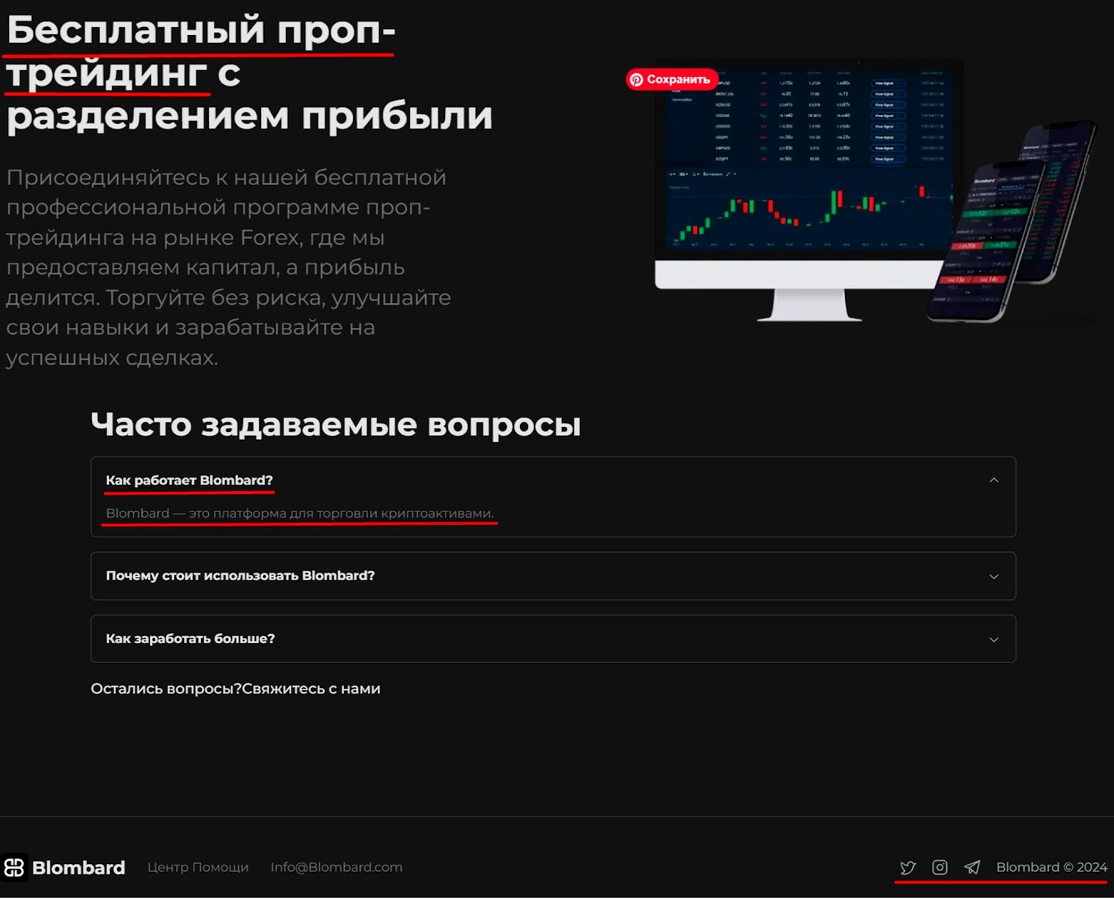 Сервис blombard предлагает бесплатный проп-трейдинг. Брокер сообщает, что может предоставить капитал, а полученную прибыль разделить между трейдером и платформой. Но не указан размер капитала и процент дохода. В блоке с вопросами только 3 ответа с минимумом информации.