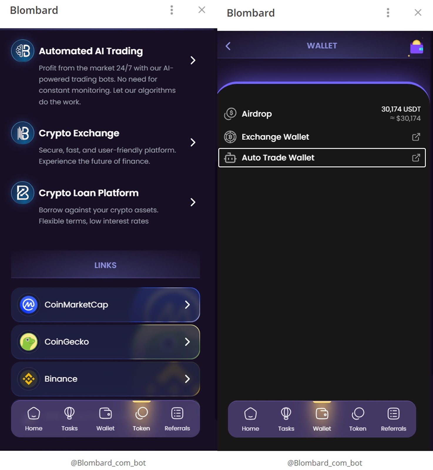 В меню приложения есть ссылки на трейдинг с ИИ, биржу blombard exchange и сервис с кредитованием. Дополнительно есть меню с официальными страницами проверенных платформ, например, CoinMarketCap и Binance.