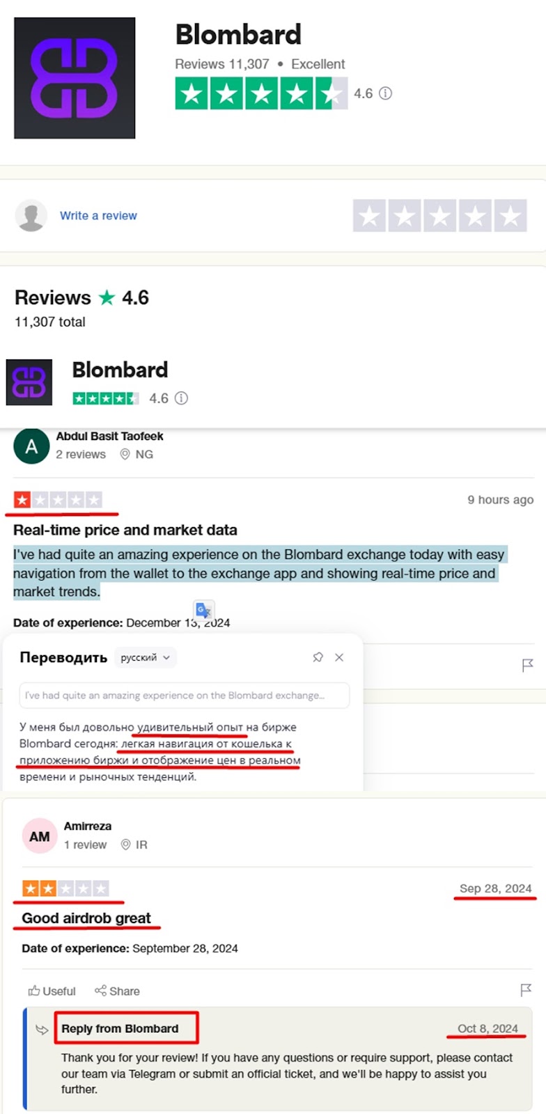 Отзывы о бирже бломбард смешанные. Например, на сайте Trustpilot 11 тысяч отзывов с высоким рейтингом, но пользователи оставляли комментарии о проекте за 10$. Что говорит о маркетинговом ходе и не отражает реальной ситуации. При проверке были найдены негативные сообщения, но они были не объективны и не описывали проблему клиента.