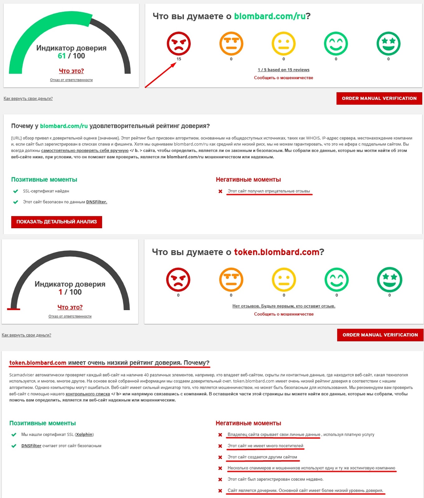 На специализированных сервисах можно увидеть, что сайты blombard com и token blombard com имеют сомнительную оценку. Например, про сайт blombard com есть только негативные отзывы. Веб-страница token blombard com считается дочерним проектом от сервисов, которые занимаются мошенничеством.