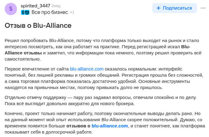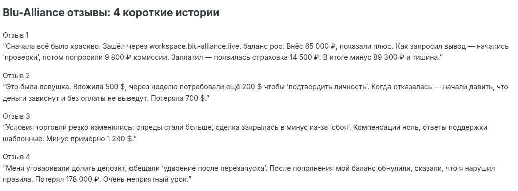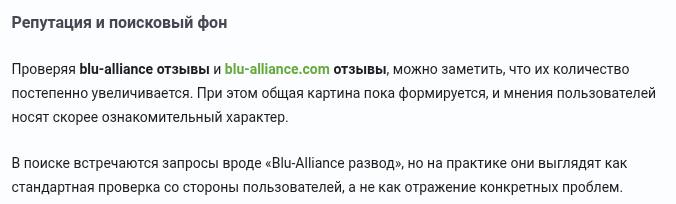 Положительные отклики встречаются на нескольких ресурсах, но при ближайшем рассмотрении оказывается, что это SEO-тексты с ключевыми словами по типу «blu-alliance отзывы», «blu-alliance com отзывы». Ни одного конкретного факта о реальной сделке или выводе средств. Все они однотипные, без фактов, восхваляют компанию и т.п. Возникает ощущение, что написаны по одному сценарию.