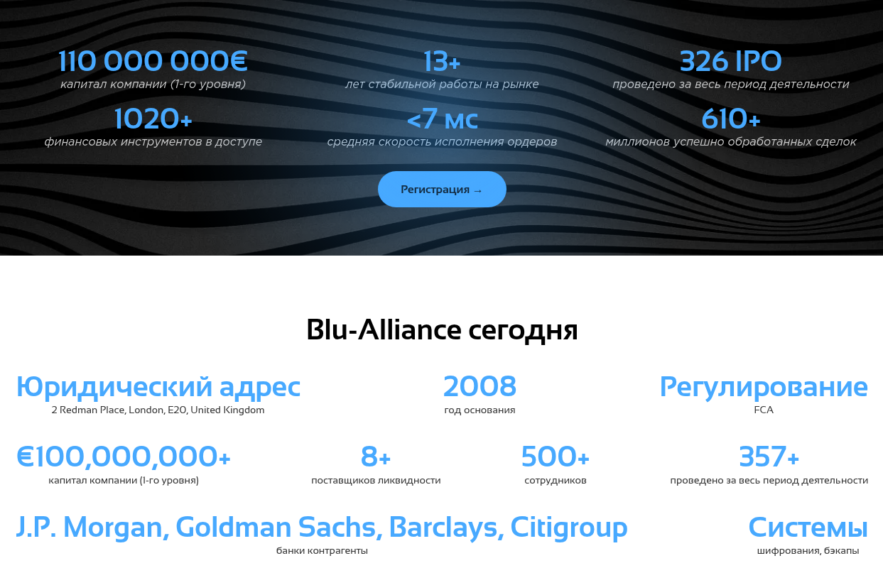 Брокер Blu Alliance работает на домене blu-alliance com, зарегистрированном в 2013 году. Проект ориентирован на глобальную аудиторию, включая русскоязычных пользователей. На сайте указан адрес: 2 Redman Place, London, E20, United Kingdom. Дата основания по заявлению создателей — 2008 год.